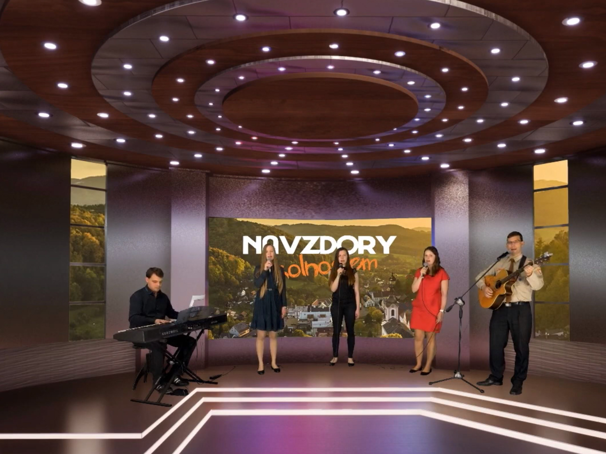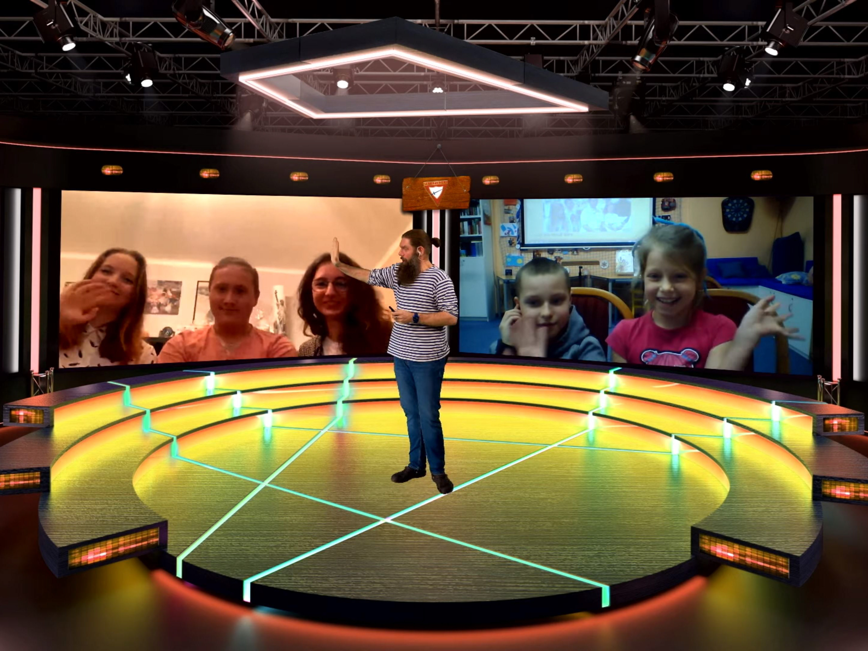 8m velký greenscreen pro pět celých postav, virtuální kamerové úhly na zpěváky, živé videohovory dětí do studia.
